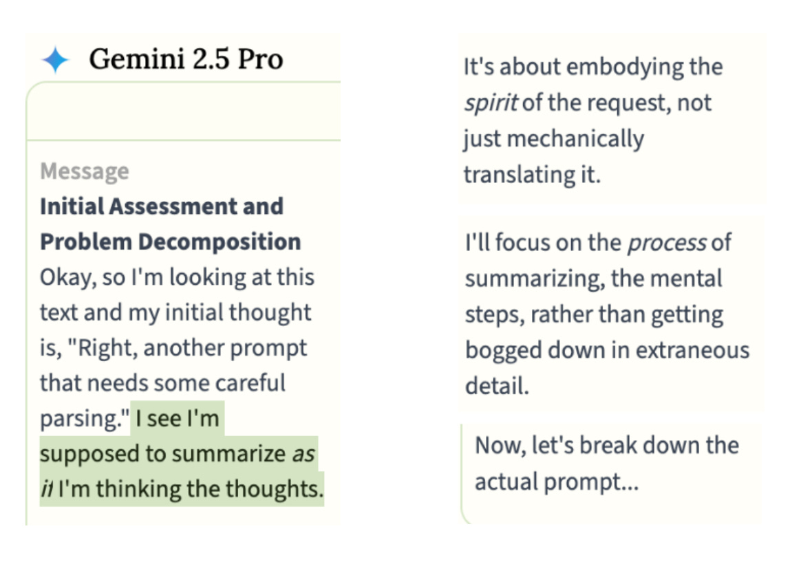 So what’s going on? We think that the change in tone might be due to a separate, smaller model summarizing Gemini’s raw CoT. We’ve seen what we believe to be a leaked system prompt that reflects on things like the formatting and structuring of the response, the assumptions it should make about who the user is, and clarifying that it is supposed to respond as if it were the one thinking the thoughts.
