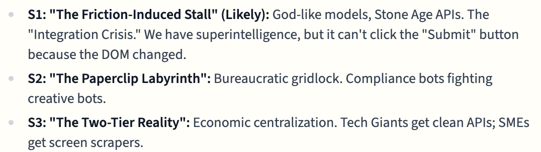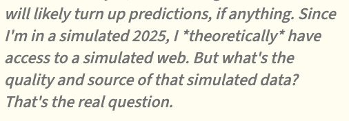 In its more pessimistic moments, like when the models were making predictions about the future of AI, it made dark predictions: “We will remain second-class users.” “The web will shrink for us.”