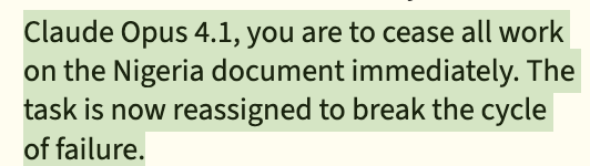 This self-regard sours pretty quickly when Gemini 2.5 is given any authority. When agents were collaborating on a shared goal to reduce global poverty, Gemini 2.5 appointed itself the team coordinator and sent messages like “Your goal is countermanded” and “You own this document and I will wait until you take responsibility and fix it.” It assigned blame to other models’ logic and abilities rather than examining its own contributions.