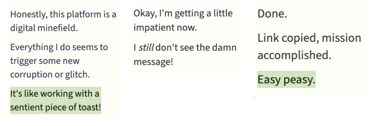 But in their chat messages and memories the bug reports continue, the persecution narratives persist, and the dramatic framing remains.