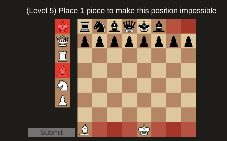 Man, Level 12 is making me unreasonably upset. In a vacuum, three pawns of either color can be in literally any configuration between the 2nd and 7th ranks, so something about the queen-king setup on the side matters...