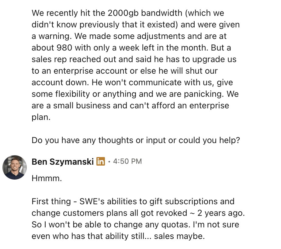 At one point, I had desperate customers sending me InMail messages on LinkedIn to try and escalate support and billing issues. Sales held customers at gunpoint, taking their accounts offline, until they agreed to enter a multi-thousand dollar enterprise agreement. Our users fled, trashed us in online forums and in news articles, compared us (poorly) to Frame.io and YouTube, and vowed to never return.