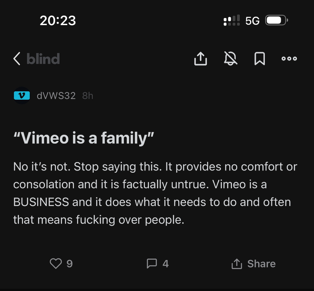 In March 2024, employees woke up to headlines of Bending Spoons’ acquisition of Vimeo, and it sent shockwaves through the company. Bending Spoons, an Italian private equity/accelerator, infamous for purchasing flailing American tech companies, laying off most employees, importing the project to Italy and running it off of a lean team meant that most of us were going to be ex-Vimeans if the deal went through. We didn’t even know we were on the table to be sold. Slack channels lit up, and so did the internal Vimeo message board on Blind.