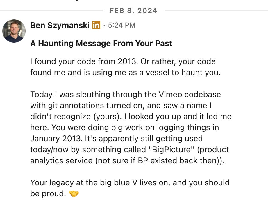 Yet despite the tendency towards precaution, bugs kept surfacing, mostly from older, un-maintained code. When you’d check the git annotations, you’d see that the file was last touched, in say, 2013. I found something funny in one of the files left behind by a former Vimean. It was funny enough that I actually found him on LinkedIn and sent him an InMail and had a short conversation with him. Turns out that after Vimeo, he joined Apple.