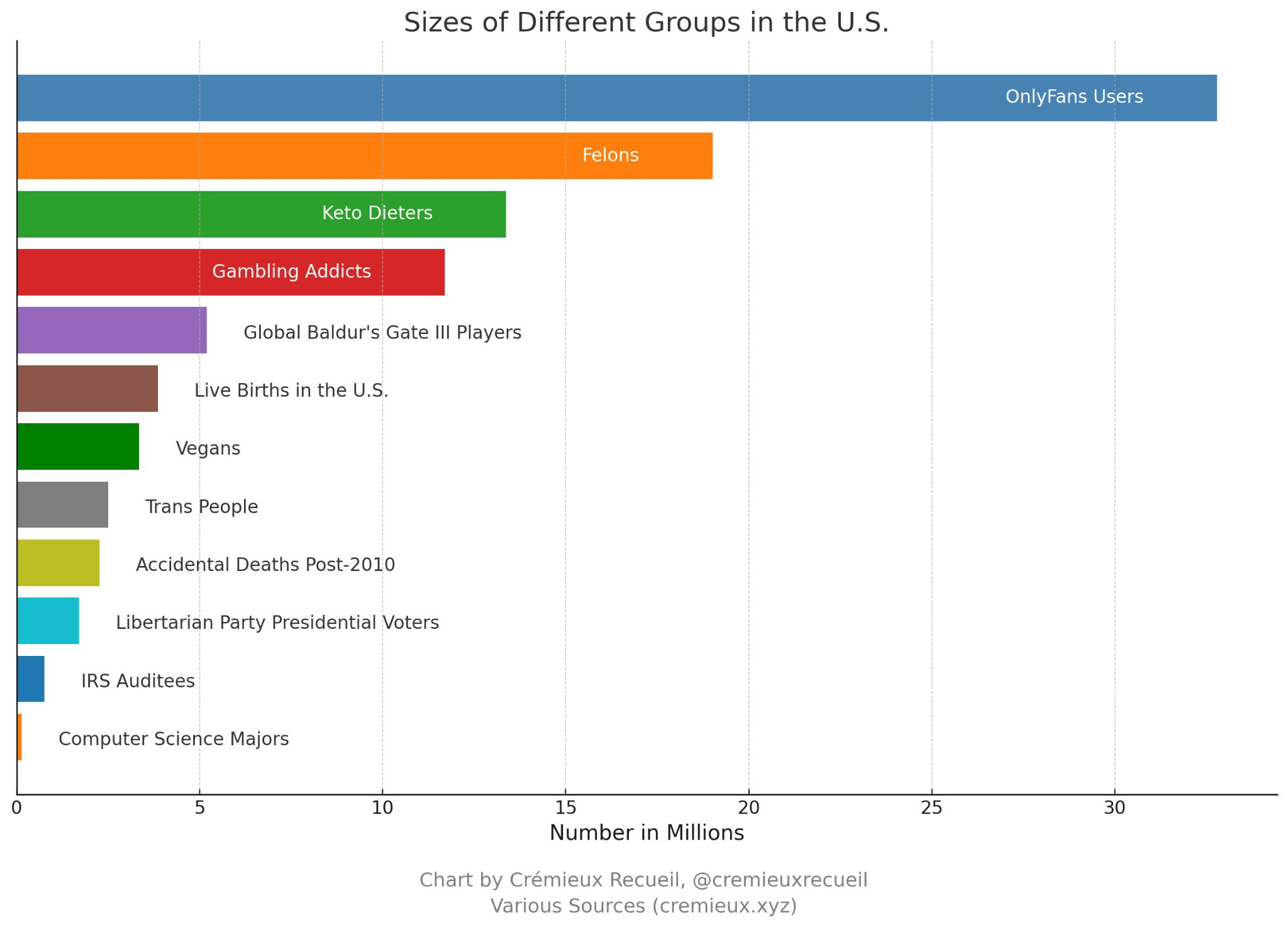 For context there are about 37 million registered republicans and 45 million registered democrats. Perhaps the next president will rally a Stimulants + Botox + OnlyFans coalition.