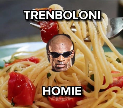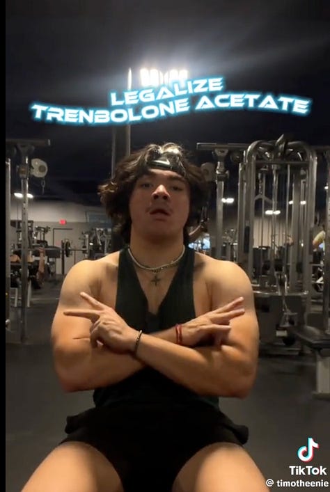 I mean the discourse exists, kind of. Joe Rogan and Bryan Johnson are major cultural influencers, and even the NY Times is writing about women experimenting with microdosing testosterone. In the more experimental, freer parts of the media landscape, you can find real cultural pioneers - my friend Richard, who has cultivated an e s o t e r i c tiktok algorithm, receives schizo bodybuilder steroid media:
