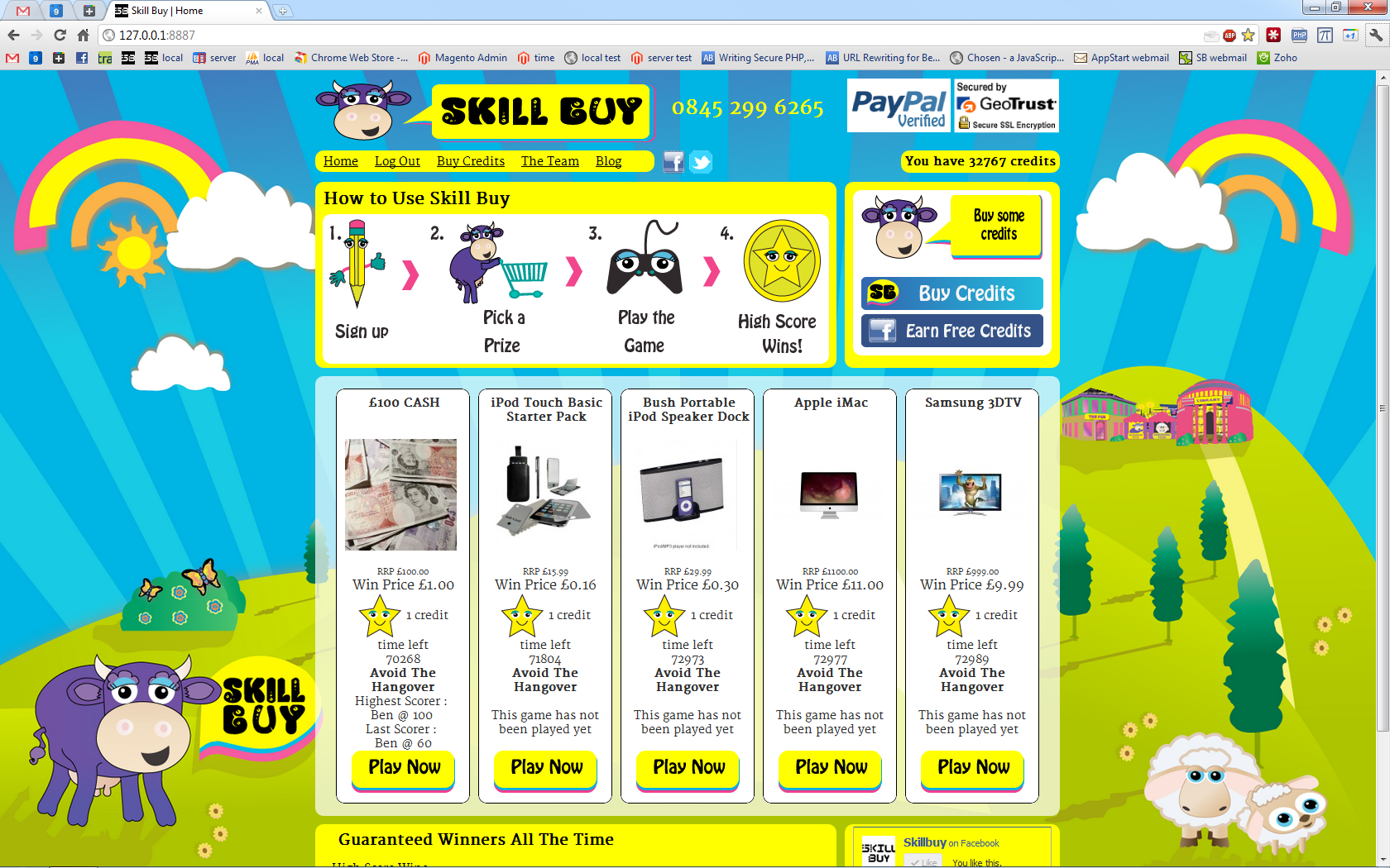 So on my first day, Alex told me the project I'd be working on was called Skill Buy, and proceeded to explain the concept. The idea was similar to an auction site that was popular at the time where you could bid on a product, but you paid for every bid – so if you saw an iPhone with a winning bid of 1p, you could bid 2p, but if you were outbid, you'd lost your 2p – eventually someone would win it at a bargain price at the expense of everyone who'd bid before them and the company would make a fortune. They're called penny auctions and you can read about them in this paper: Are online penny auctions a form of gambling? Anyway – the idea I'd been told about was similar, but instead of bidding, you'd play a game (a Flash or Unity game made by the game devs I was working with) – and it worked like an arcade game – the winner gets the prize. You'd buy credits, spend your credits playing games, and if you were the top scorer at the end of the game's countdown timer, you'd win the prize. Actually you'd win the prize at 99% discount because they seemed to think that got around gambling laws.