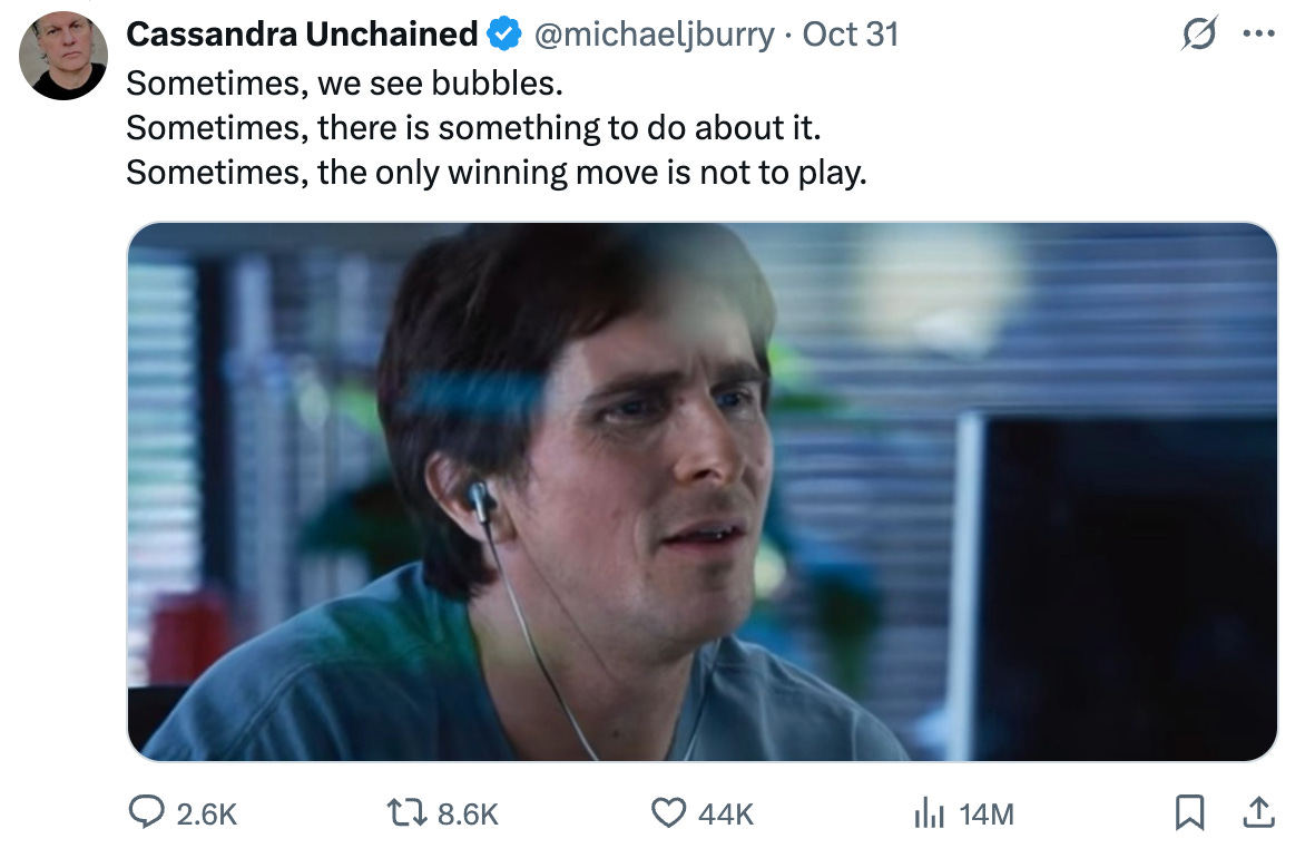 Signs that the narrative switched to a bubble vibe started a few months ago. In September Mark Zuckerberg on the Access podcast said that “if we end up misspending a couple of hundred billion dollars, it’s going to be very unfortunate, but the risk is higher on the other side if you build too slowly”. One month later, Jeff Bezos said that AI is a bubble, but a good one, and “when the dust settles and you see who are the winners, society benefits from those inventions”. For example we got to use all the fiber optic cables that have been laid out during the internet bubble of the early 2000s, although the companies that laid out those cables went out of business. More recently, Michael Burry came back to Twitter to hint that he was taking bear positions in the AI space, which was later discovered were puts against Nvidia and Palantir. The tweet came out around the time Nvidia and Palantir hit their all time high market price, and both stocks dropped since then.