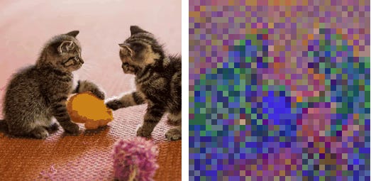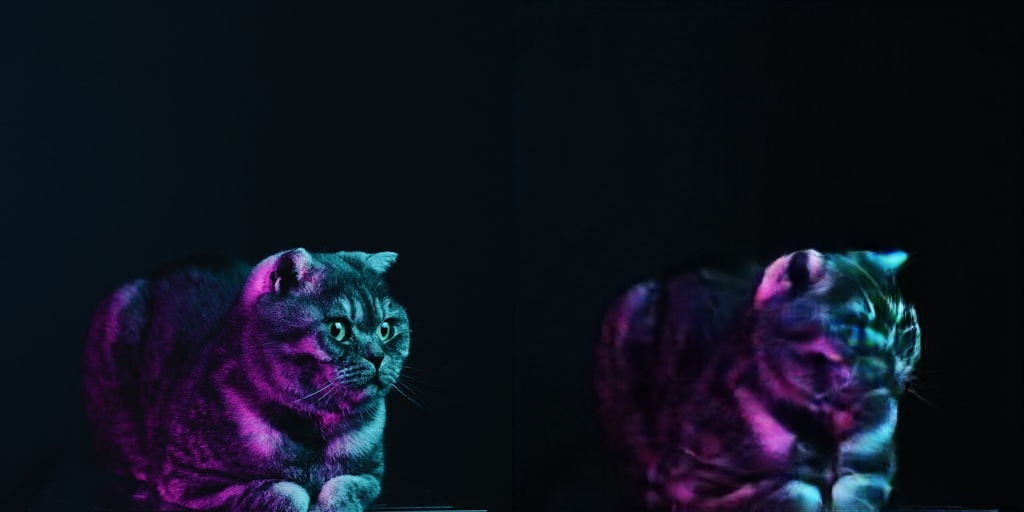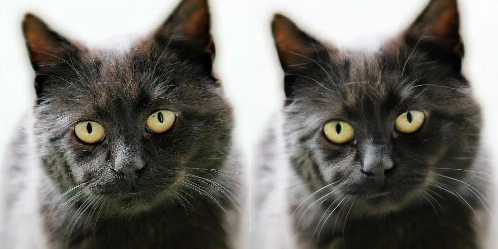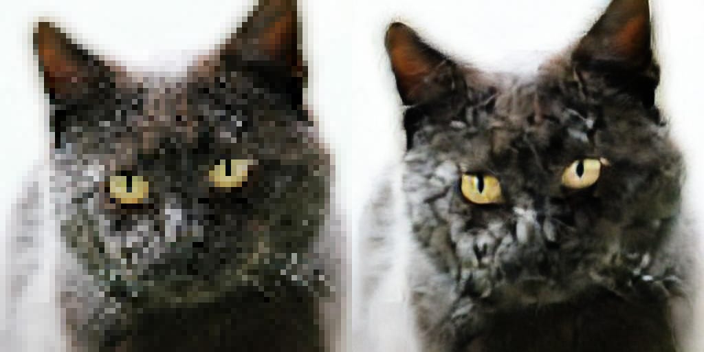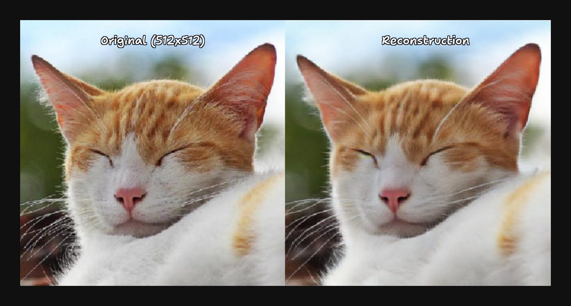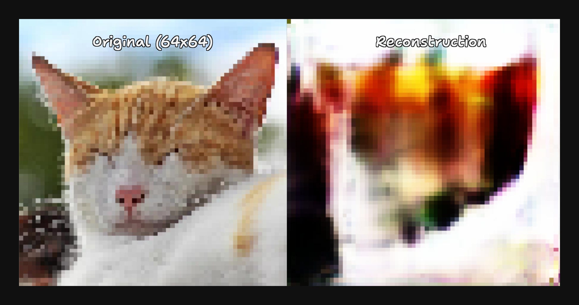 The reason for this is most likely because the model was trained solely on cat images; while it did learn some general image compression, it also got good at compressing feline-specific features such as the nose, ears, etc. These two compressions (general purpose and feline-specific) compete and caused this dog’s nose to turn out a little different in the reconstruction.