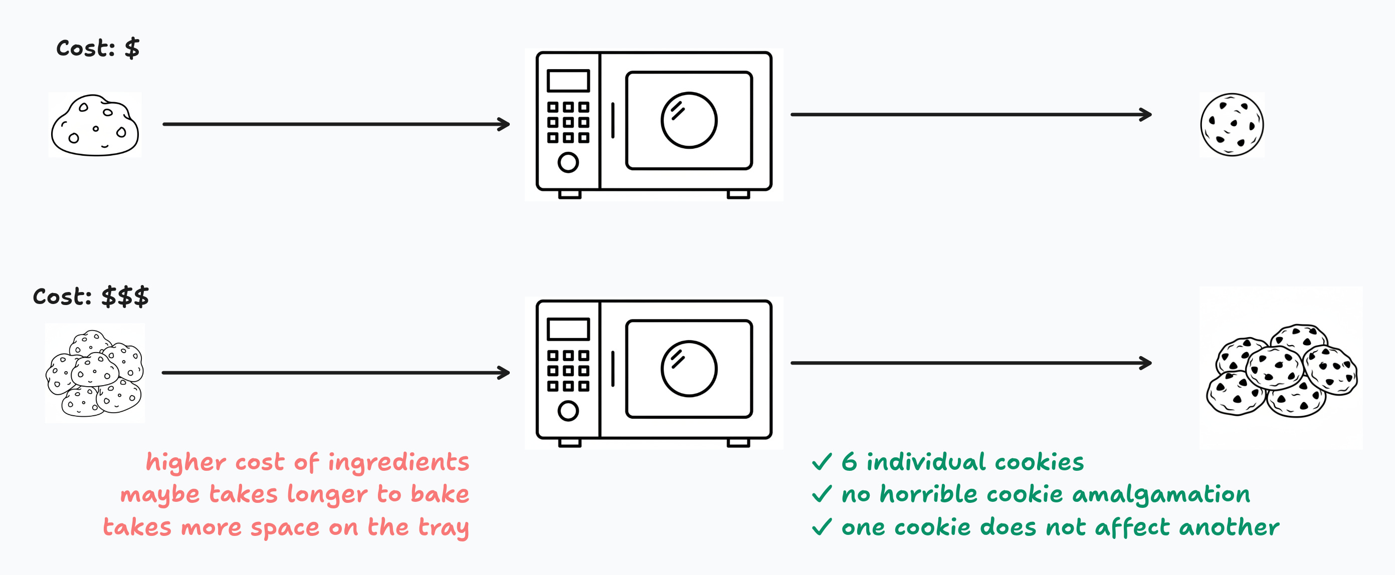 Or, you could spend a little more time and money making dough for a batch of 6 cookies, put them on a tray and bake them. You’d get 6 cookies. The dough from one cookie doesn’t magically transfer to another cookie — each cookie maintains it’s individuality in the process.