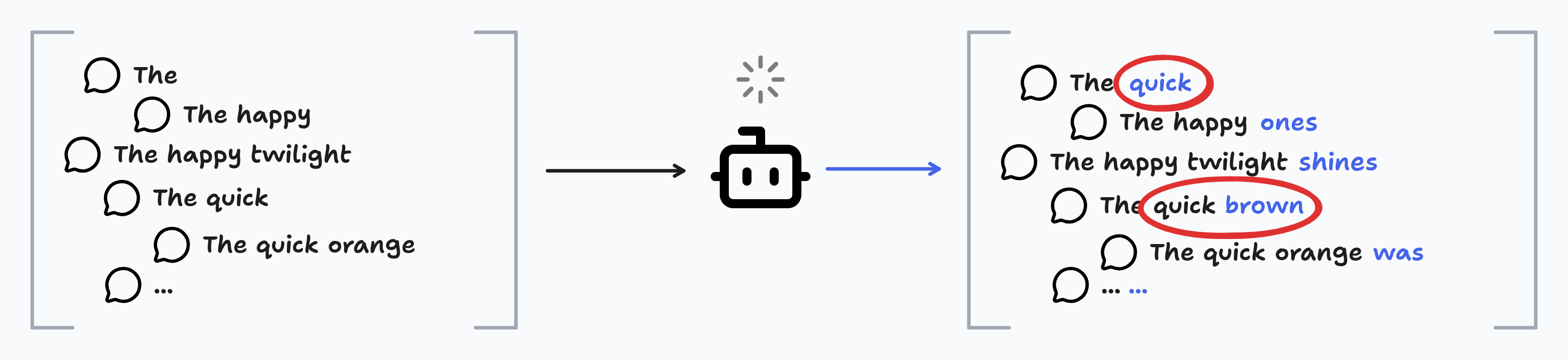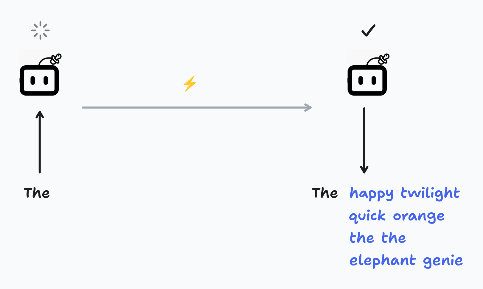 With “quick” as the 2nd word, the smaller model generated “orange” as the 3rd word. The sequence “The quick” was fed to the larger model, which generated “brown” as the 3rd word, telling us that the smaller model’s prediction of “orange” was incorrect.