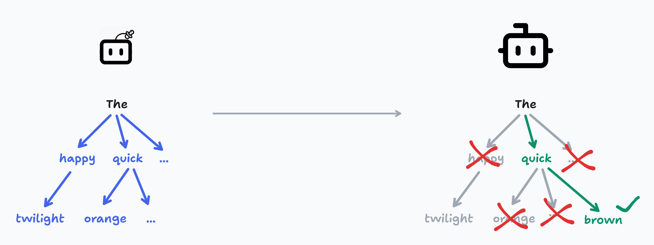 First, the larger model generated the word “quick”. This means that the other guesses for the 2nd word by the smaller model were wrong, and we can discard those.