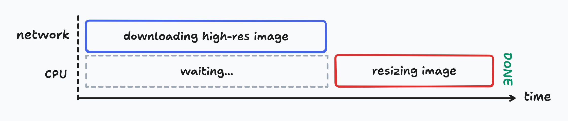 Let’s say you have two processes, where one depends on the output of the other. Say, downloading an image and resizing it to make it smaller.