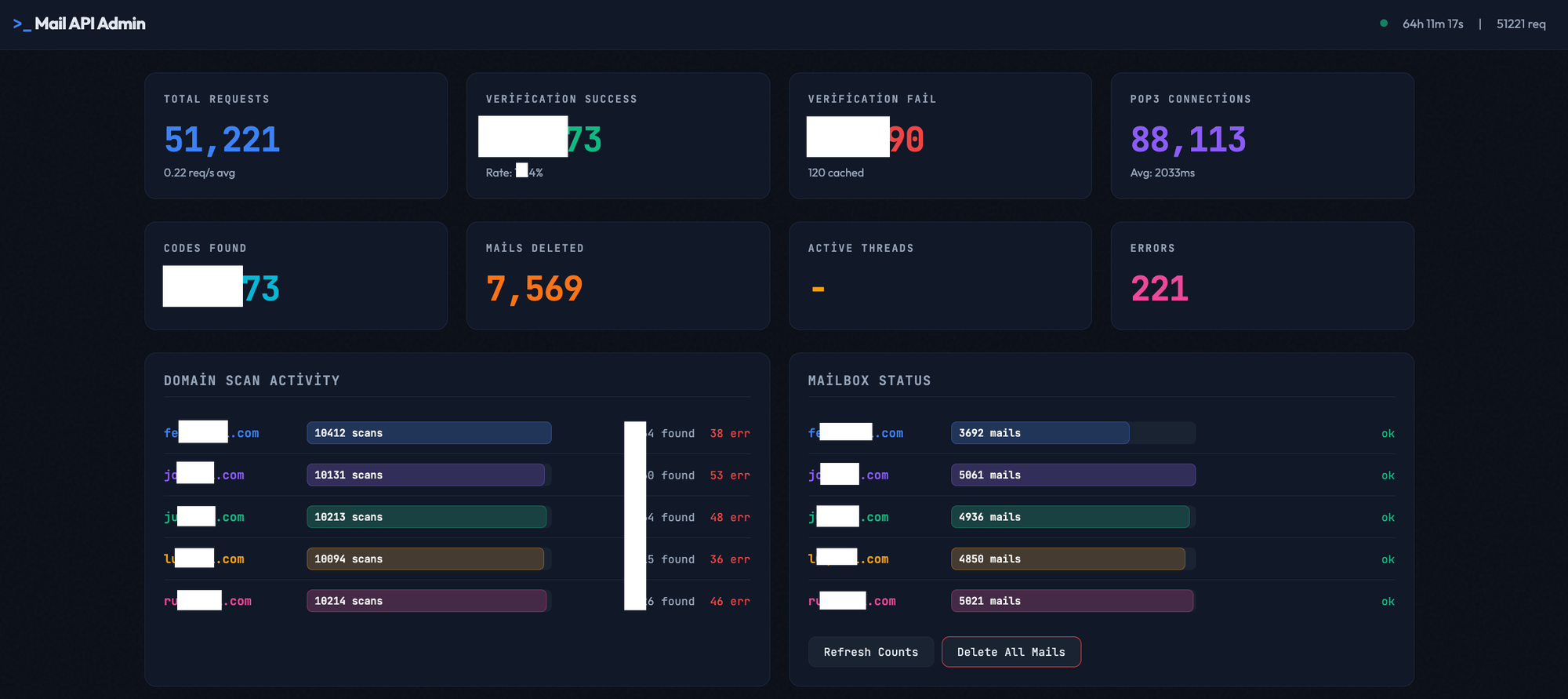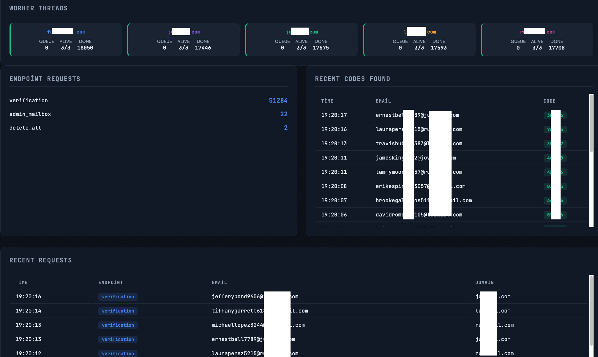 These metrics illustrate the operational scale of the infrastructure. The system continuously polls mailboxes, extracts verification codes from incoming emails, and exposes them through an API that the automation can query in real time during the account creation flow.
