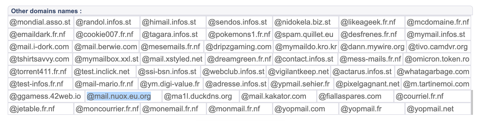 At the time of writing, the service offered inboxes on the following domains: