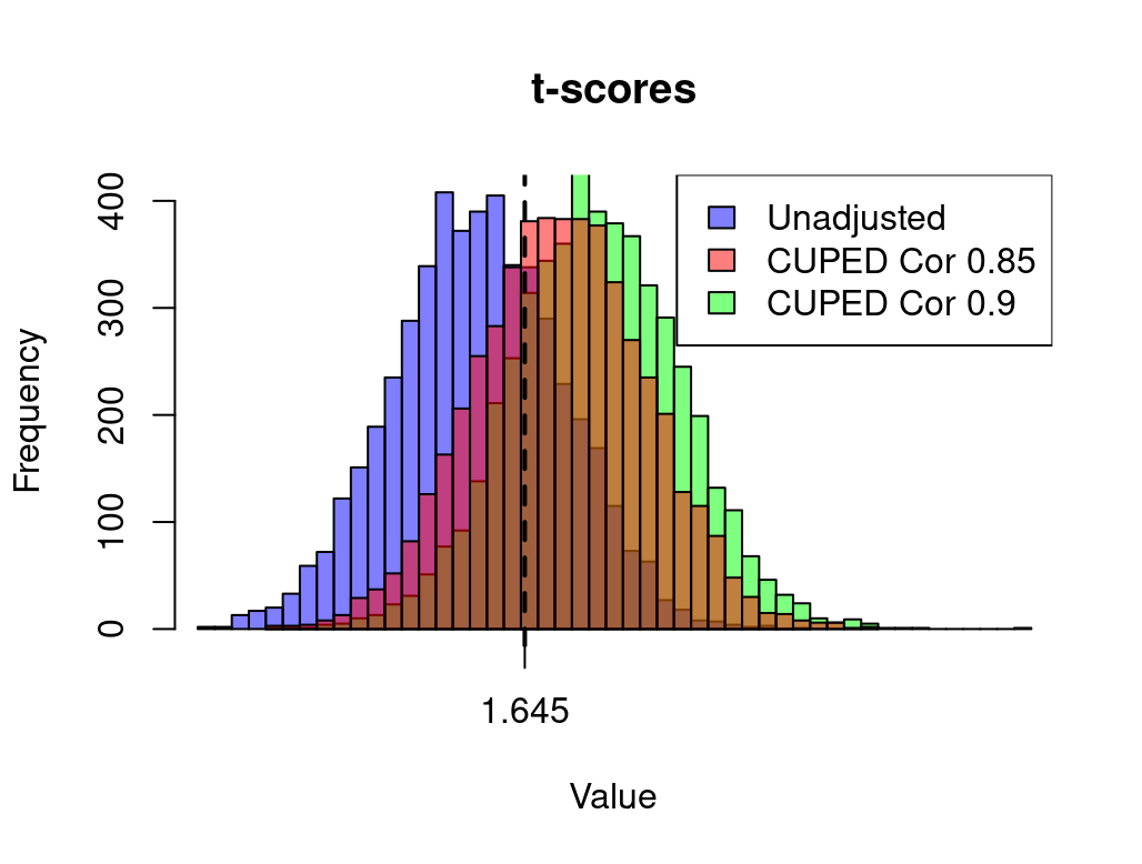 The unadjusted A/B tests (Purple) are shifted to the left of the 1.645 critical value with 70% of all tests failing to reject the null for the one tailed 95% confidence test. This make sense because we only have 19% of the required sample size. The regression adjusted test with the correct estimate of 0.9 (Green) has just 19.8% of the tests to the left of the 1.645 critical value, which is the expected 20% fail to reject rate (80% power). The regression adjusted tests using a covariate that has only 0.85 correlation rather than 0.9 (Red) is shifted to the left such that we fail to reject 34% of the tests, for a power 66%. So even though we have data that can massively increase the precision of our results versus the unadjusted t-test, we still wind up running under powered tests. Which of course is highly ironic. It means that exactly when CUPED/Regression adjustment are most useful, if we are not careful in our thinking and application, it is also exactly when we are mostly likely to increase our chances of running highly underpowered tests.