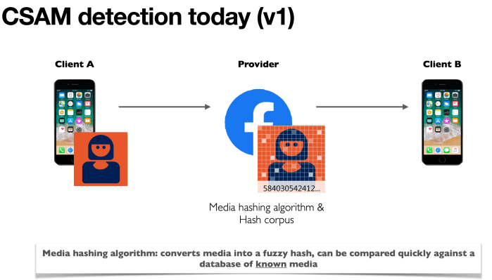 The only serious proposal that has attempted to address this technical challenge was devised — and then subsequently abandoned — by Apple in 2021. That proposal aimed only at detecting known content using a perceptual hash function. The company proposed to use advanced cryptography to “split” the evaluation of hash comparisons between the user’s device and Apple’s servers: this ensured that the device never received a readable copy of the hash database.