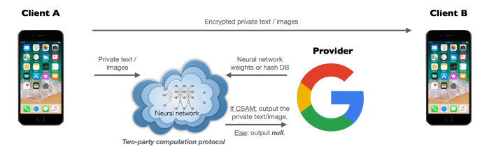 This makes everything very complicated. In fact, there has only been one real-world proposal for client-side CSAM scanning that has ever come (somewhat) close to deployment: that system was designed by Apple for a (now abandoned) client-side photo scanning plan. The Apple approach is cryptographically very ambitious: it uses neural-network based perceptual hashing, and otherwise exactly follows the architecture described above. However, critically: it relied on a neural-network based hash function that was not kept secret. Disastrous results ensued (see further below.)