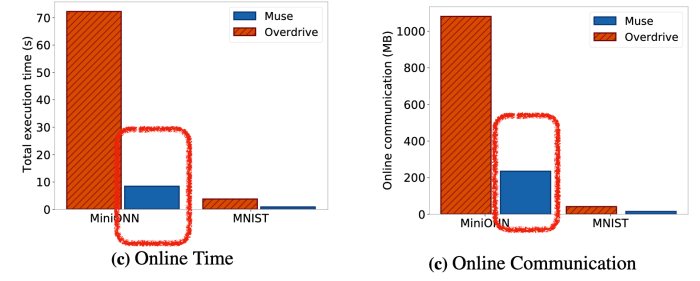 For an example of this, consider this very optimized two-party MPC scheme aimed at performing neural network classification. This scheme takes (from the client) a 32×32 image, and evaluates a tiny 7-layer neural network held by a server in order to perform classification. As you can see, evaluating the model even on a single image requires about 8 seconds of computation and 200 megabytes of bandwidth exchange, for each image being evaluated:
