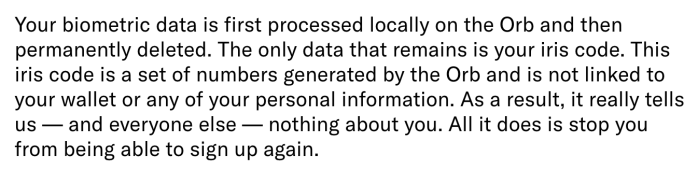 Worldcoin makes a few important claims about their system. First, they insist that the iris scan has exactly one purpose: to identify duplicate users at signup. In other words, they only use it to keep the same user from enrolling multiple times (and thus collecting duplicate rewards.) They have claimed — though not particularly consistently, see further below! — that your iris itself will not serve as any kind of backup “secret key” for accessing wallet funds or financial services.