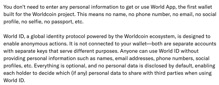 The final claim that Worldcoin makes is that they will not tie your biometric to a substantial amount of personal or financial data, which could make their database useful for tracking. They do this by making the provision of personally identifiable information (PII) “optional” rather than mandatory. And further, they use technology to make it impossible for the company to tie blockchain transactions back to your iris record: