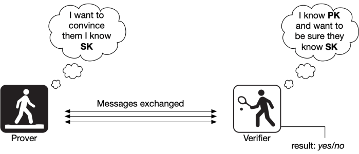 The identification protocol itself is run interactively between two parties — meaning that the parties will exchange multiple messages in each direction. We’ll often call these parties the “prover” and the “verifier”, and many older papers used to give them cute names like “Peggy” and “Victor”. I find this slightly twee, but will adopt those names for this discussion just because I don’t have any better ideas.