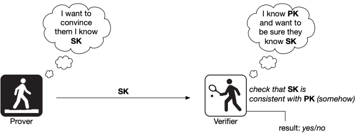 The “obvious” answer would be for Peggy to send her secret key sk over to Victor, and then Victor could just check that pk = F(sk). But this is obviously bad for the reasons discussed above: Victor would then be able to impersonate Peggy after she conducted the protocol with him even one time. And fixing this problem turns out to be somewhat non-trivial!