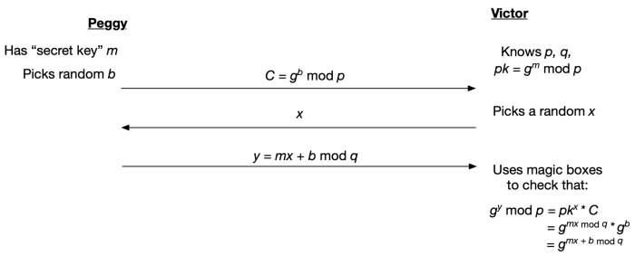We’ve made an informal argument for both of these properties above. It’s important to note that each of these arguments relies primarily on the fact that our magic box works as advertised — i.e., Victor can reliably “test” Peggy’s response against the boxed information. Soundness also requires that bad players cannot “unbox” Peggy’s secret key and fully recover her secret slope m, which is something that should be true of any one-way function.