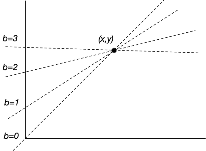If we ignore the magical aspects of the protocol, the only thing that Victor “learns” by at end of the protocol is a single point (x, y) that happens to lie on the random line chosen by Peggy. Fortunately, this doesn’t reveal very much about Peggy’s line, and in particular, it reveals very little about her secret (slope) key. The reason is that for every possible slope value m that Peggy might have chosen as her key, there exists a value b that produces a line that intersects (x, y). We can illustrate this graphically for a few different examples: