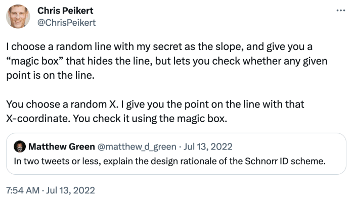 Some time back when Twitter was still Twitter, I asked if anyone could describe the rationale for the Schnorr protocol in two tweets or less. I admit I was fishing for a particular answer, and I got it from Chris Peikert: