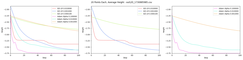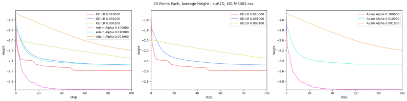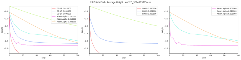 Below are graphs to show how gradient descent (GD) with different learning rates compares to Adam with different alpha parameters, and each to themselves. Also below are animated gifs showing several points of each type searching for the minimum. Gradient descent is on the left, with Adam on the right. The colored bars in the center show the relative average heights of each particle type.