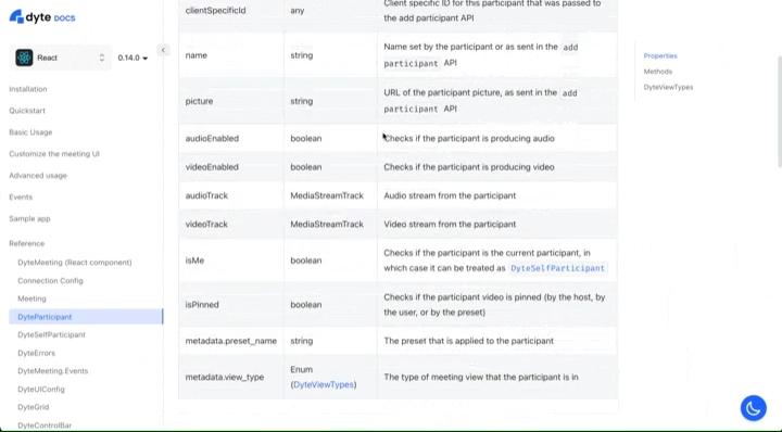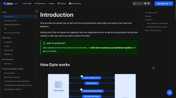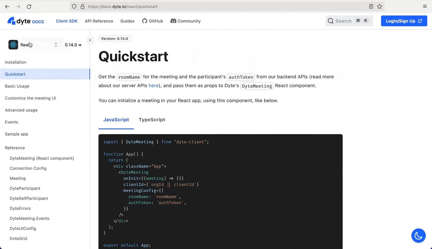 With the above principles and methodologies in mind, we have poured months of effort into bringing you our new documentation website. Head over to https://docs.dyte.io and check out what we have built.