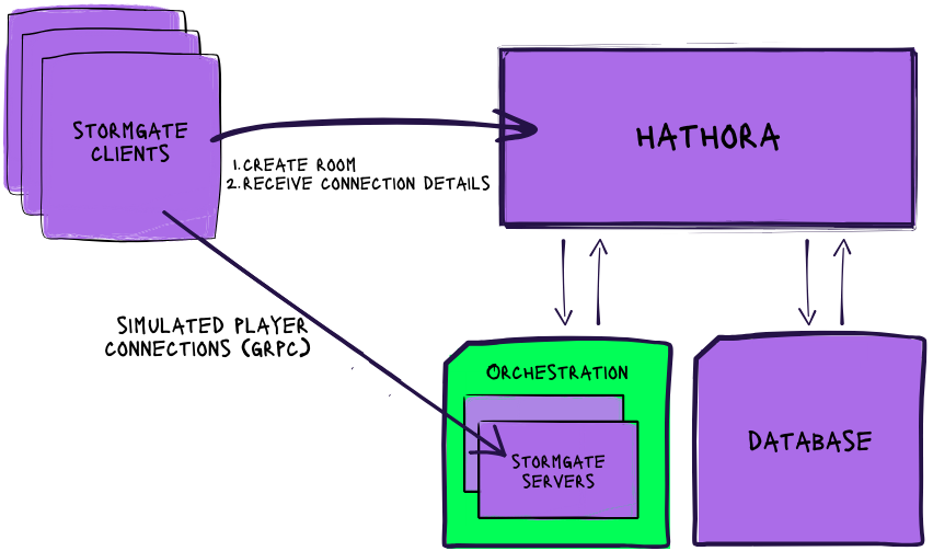The Stormgate game server was already running on Hathora, and Frost Giant provided us with a headless client that replays recordings of actual games and sends the traffic to the server. We modeled 2 players per game to simulate their 1v1 mode.