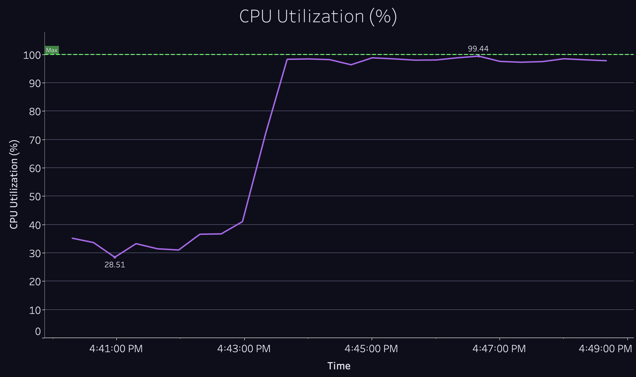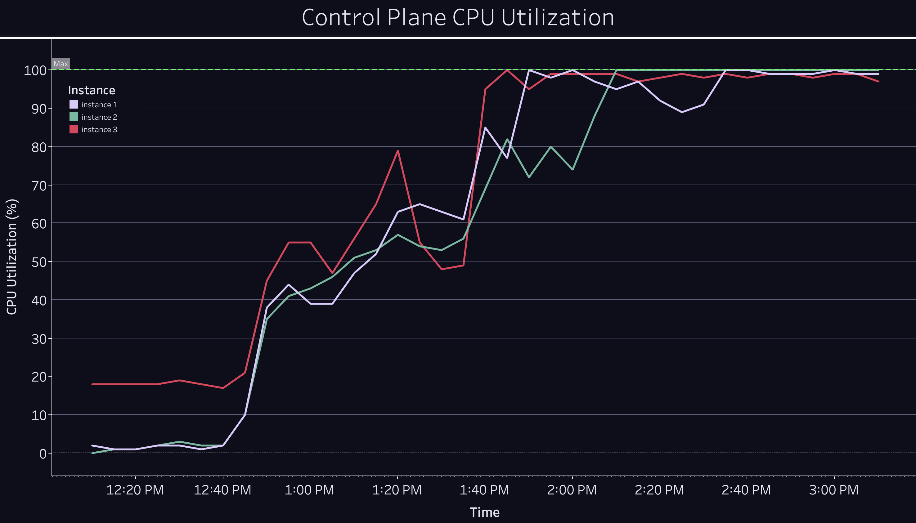 About halfway to 1 million, we saw API calls begin to fail and started receiving alerts indicating Kubernetes issues. We looked at our Kubernetes control plane, and saw that the CPU had steadily increased and eventually maxed out.