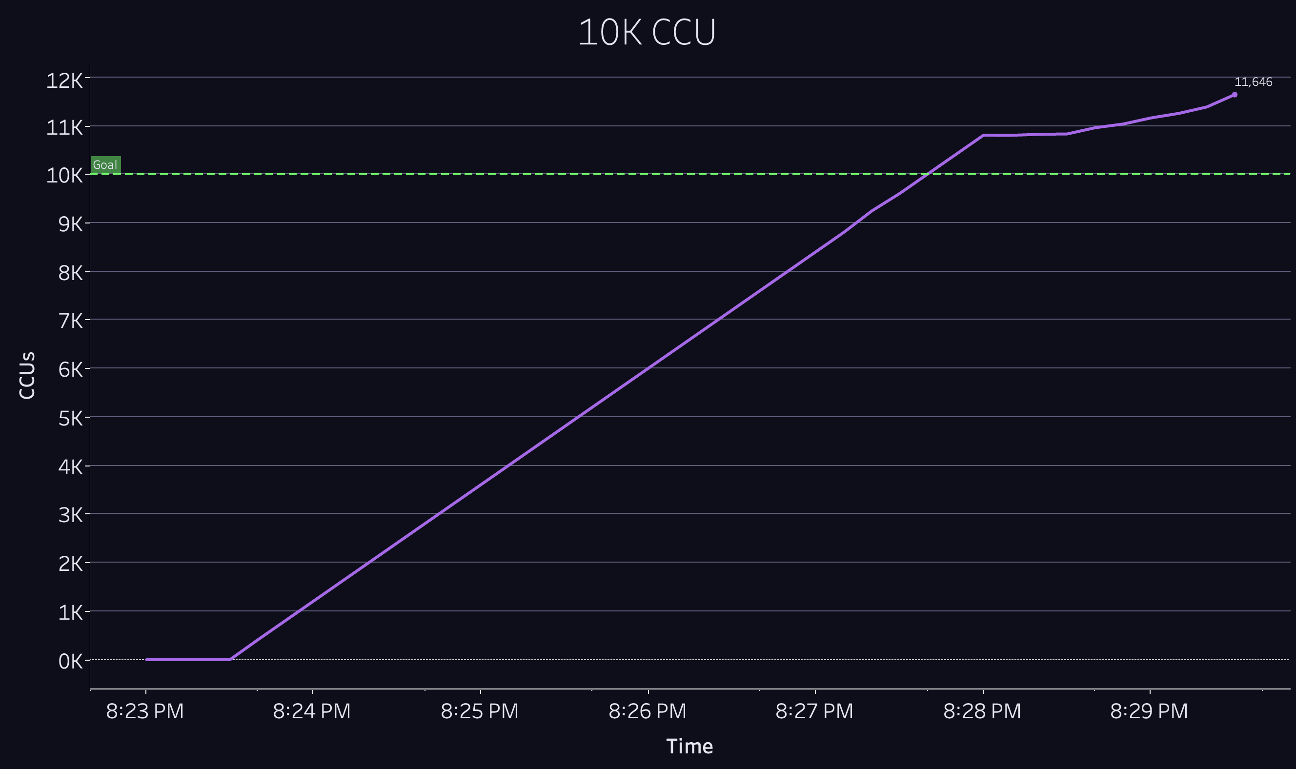 We spent some time optimizing the database interaction layer and managed to cut the database query rate in half. When we ran the test again we now cruised to our 10k CCU goal, allowing us to move onto the next milestone.