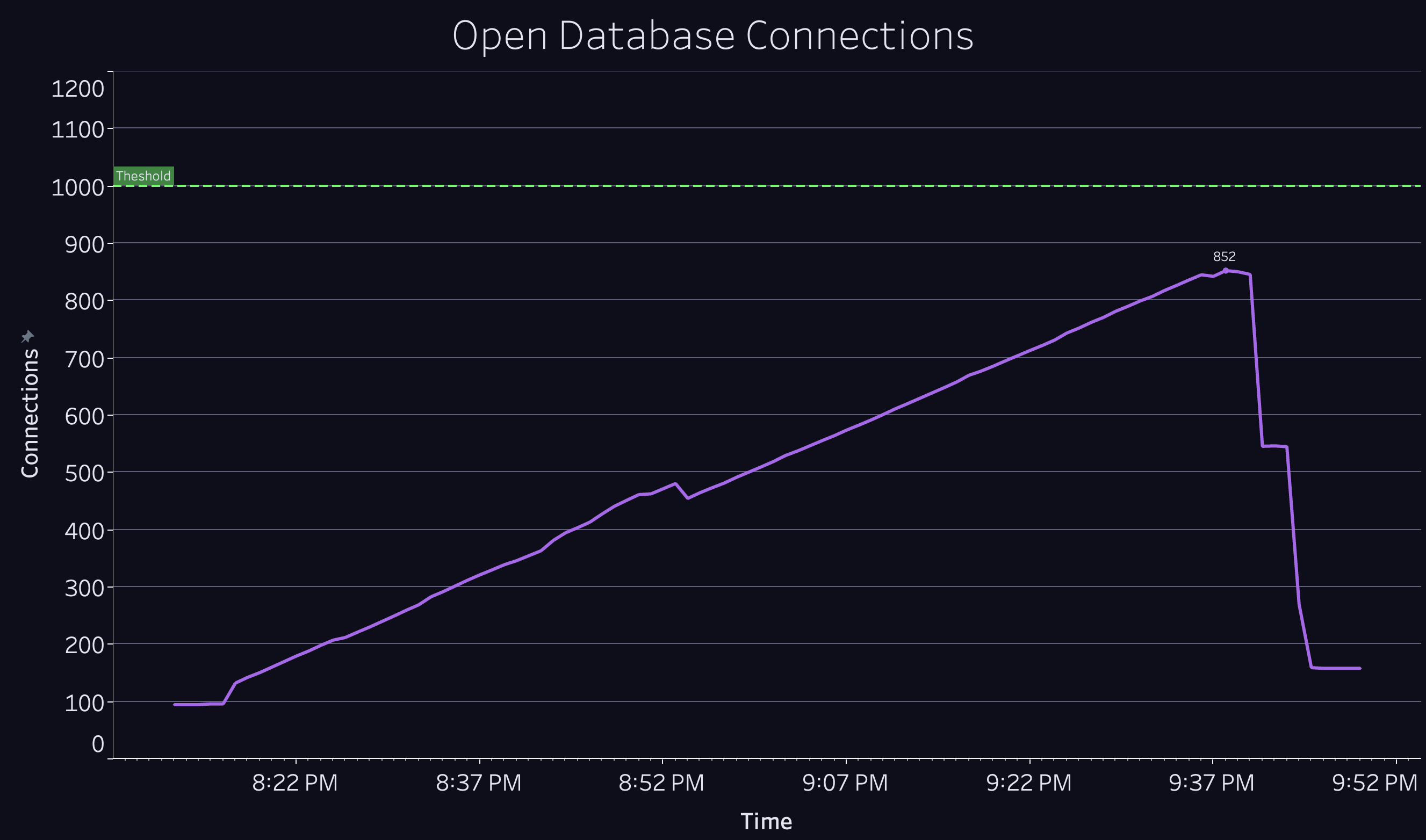 Keeping a close eye on our telemetry as we began scaling past 10k CCU, we noticed a concerning trend: the number of open database connections was increasing quickly, which added stress to our database and also put us at risk of hitting the maximum number of connections allowed.