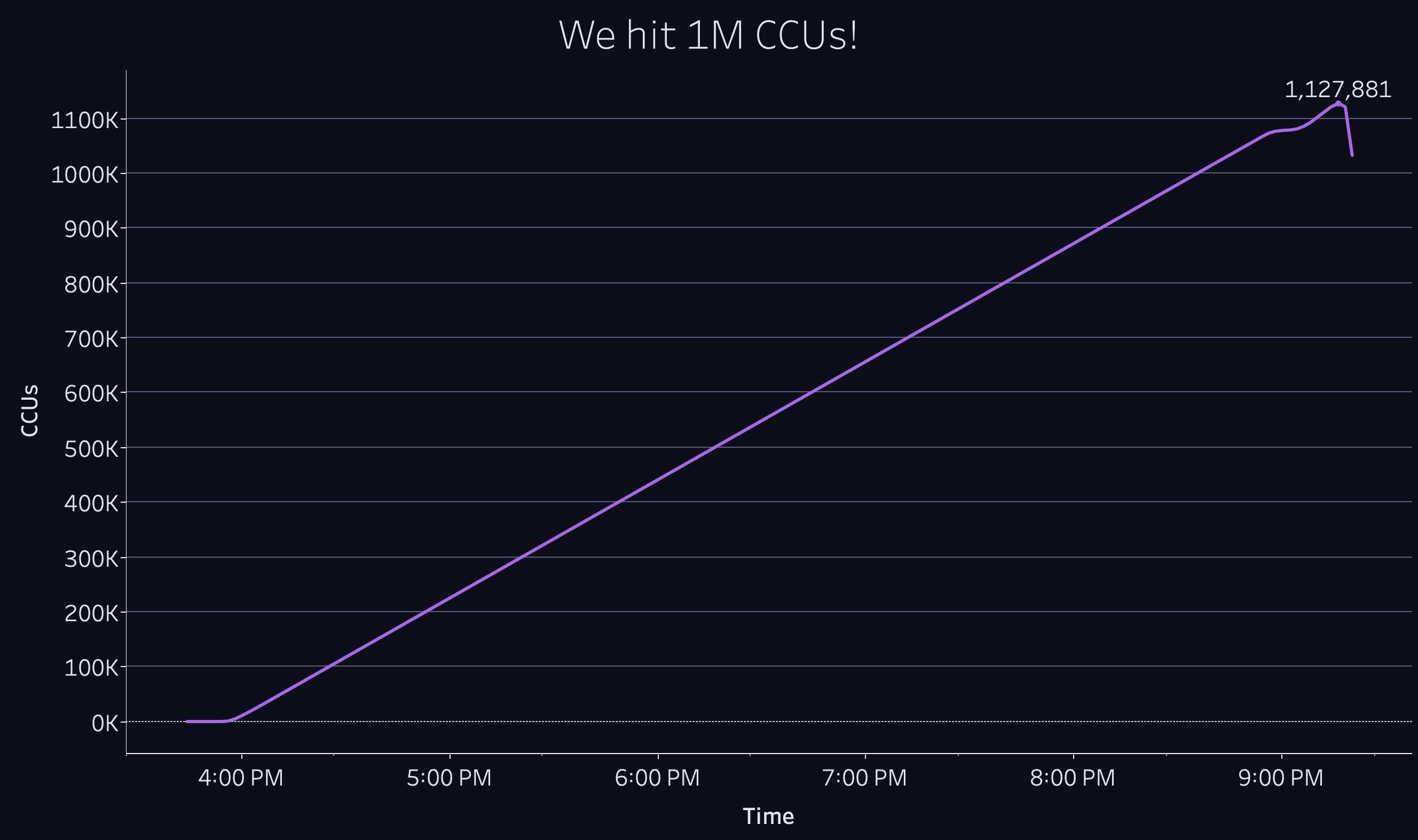 We were thrilled to see the platform scale up so smoothly, and we suspect it could have continued well past the 1.1M CCU that we cut it off at. With renewed confidence in the product we’ve built, we’re excited to onboard more game developers and studios so that they can create amazing games without worrying about scale.