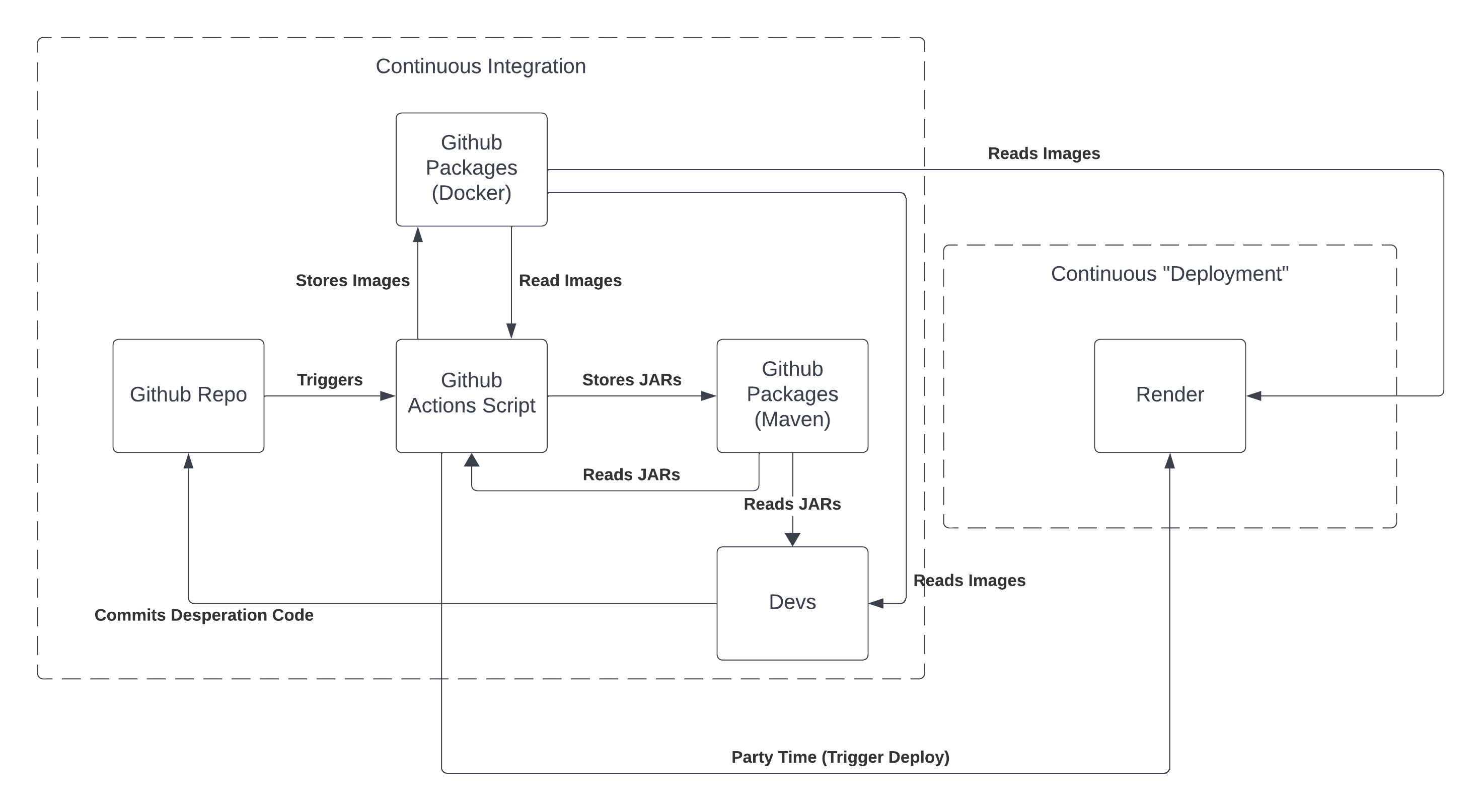 Creating JARs and putting them into Maven repos isn't really a CI/CD pipeline now is it? Ideally, we'd have a Github Organization account, and use Github packages to store library JARs and our app Docker Images, gluing it all together with Github Actions or CircleCI (or Jenkins, corpo). I don't want to pay for Github Organizations, so let's go ahead and set up some Github Actions on regular Github.