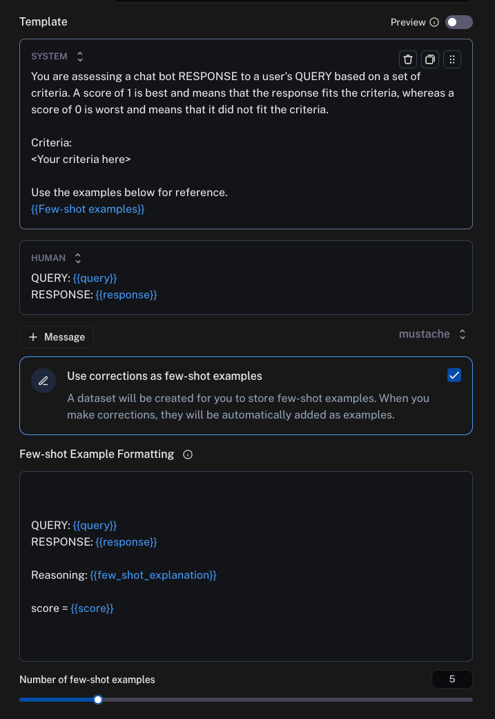 - The next time an evaluator runs, it will store those examples (and optionally, the explanations) and use those to inform its generation: In subsequent evaluation runs, the system incorporates these stored examples into the prompt for the LLM-as-a-Judge. By leveraging the few-shot learning capabilities of language models, the evaluator becomes increasingly aligned with human preferences over time.