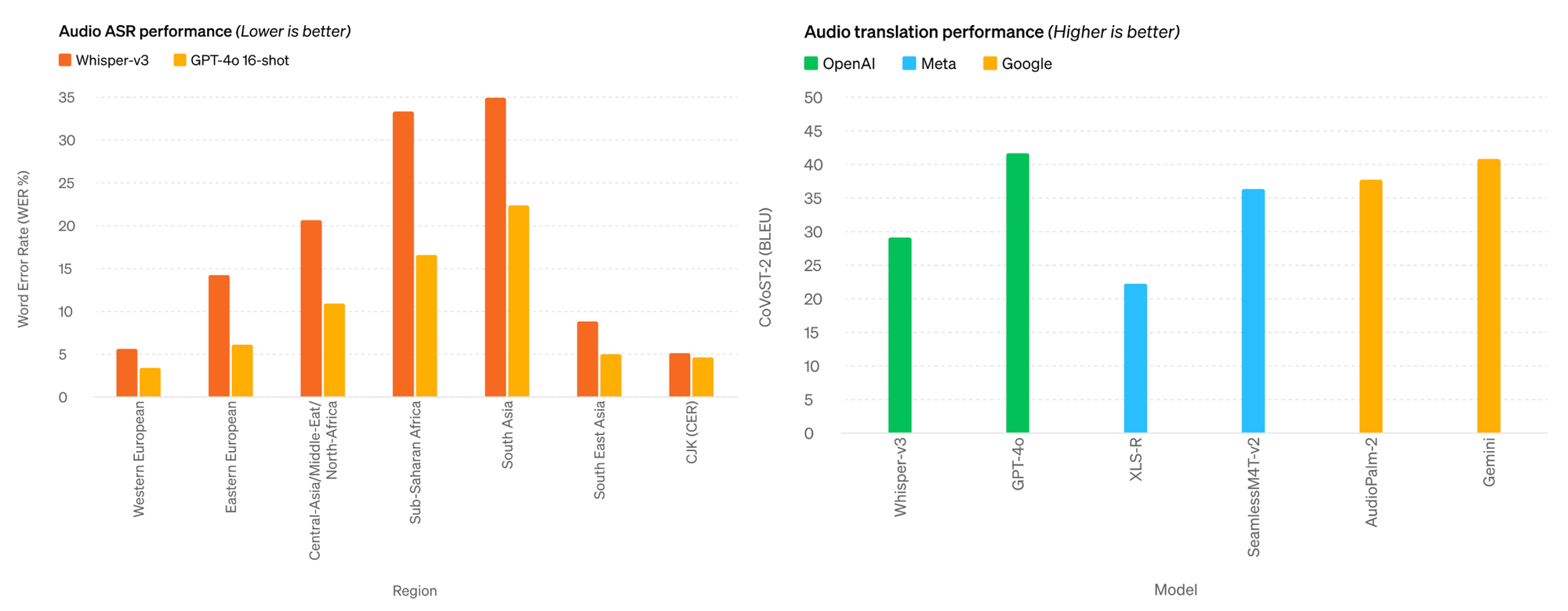 According to self-released benchmarks, GPT-4o outperforms OpenAI’s own Whisper-v3, the previous state-of-the-art in automatic speech recognition (ASR) and outperforms audio translation by other models from Meta and Google.