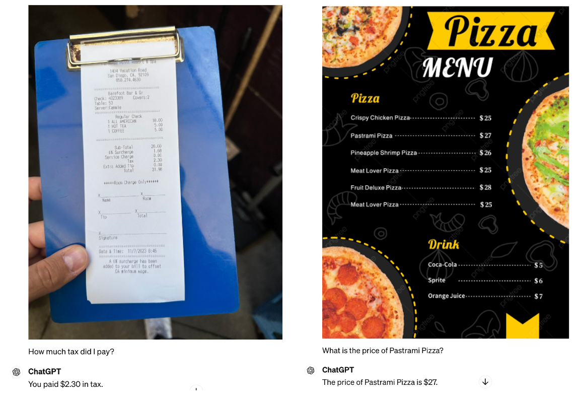 Next, we evaluate GPT-4o’s ability to extract key information from an image with dense text. Prompting GPT-4o with “How much tax did I pay?” referring to a receipt, and “What is the price of Pastrami Pizza” in reference to a pizza menu, GPT-4o answers both of these questions correctly.