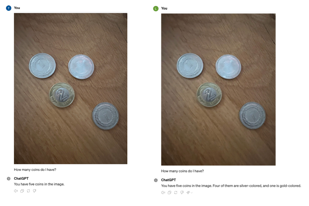 Next is a series of visual question and answer prompts. First, we ask how many coins GPT-4o counts in an image with four coins.