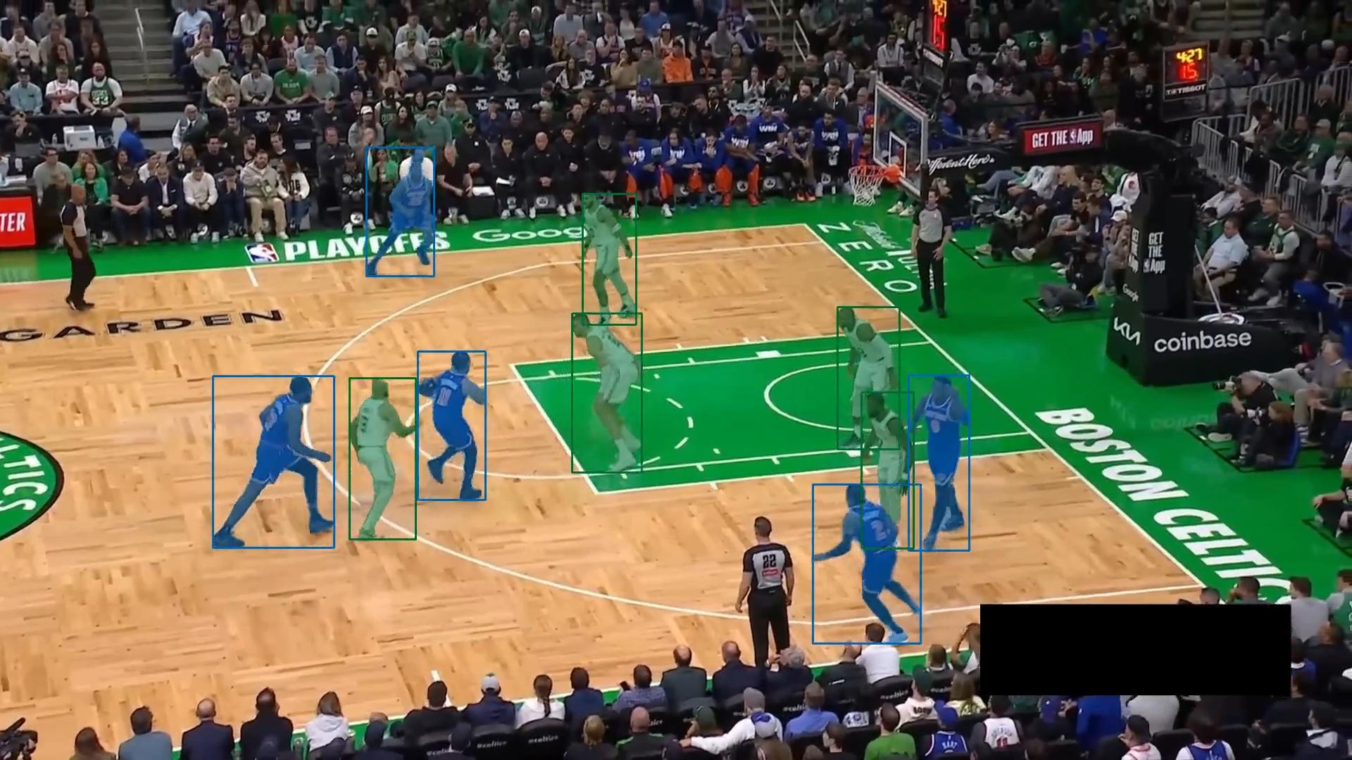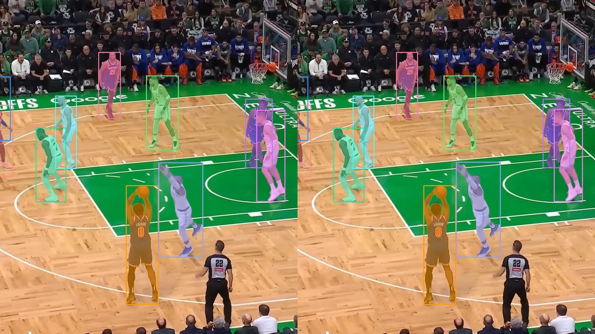 The next step is tracking. We use SAM2, which is designed for segmentation and tracking in videos. SAM2 has an internal memory mechanism (often called a ”temporal memory bank”) that stores the appearance of each object over time. This mechanism makes the model robust to occlusion. When a player is blocked and disappears from view, SAM2 uses the stored features to re-identify and continue tracking them once they reappear.