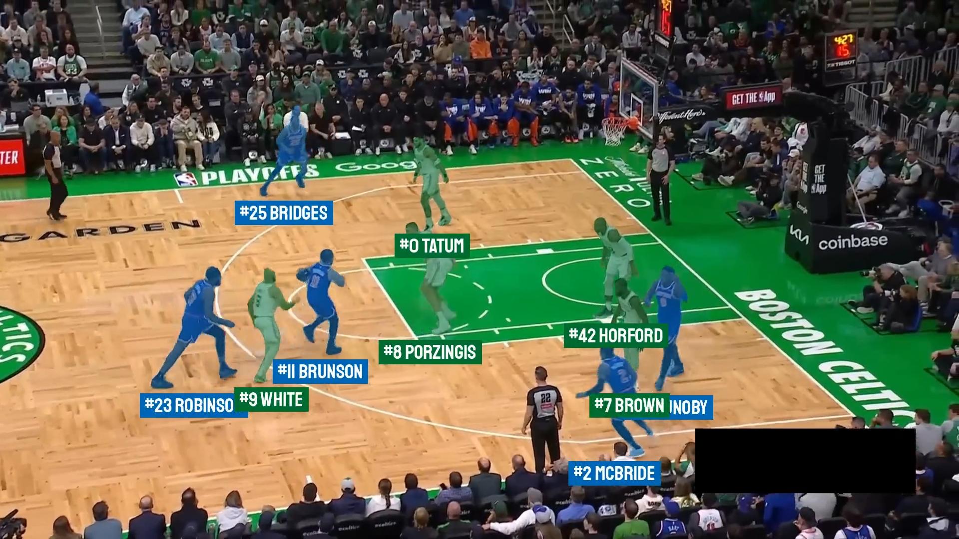 We then apply a simple heuristic: a jersey number is confirmed once the same prediction appears three times in a row. This stabilizes recognition without adding complexity. Accuracy can be improved further if we constrain predictions to the set of numbers known to be on the court at a given time. The final step is to map each confirmed number and team to a player’s name from the roster.