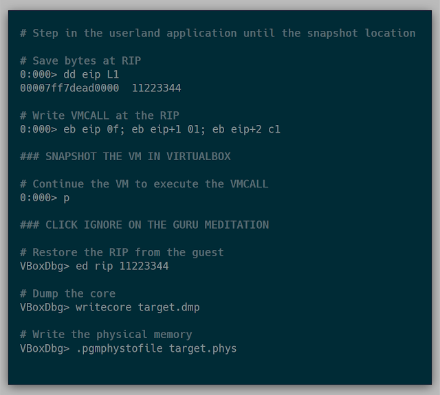 Since VirtualBox is open-source, the core dump format can easily be followed via the source and a parser can be implemented. All of the registers needed in the VMCS appeared to be in the core dump, so I went with snapshotting using VirtualBox. Once I discovered what exactly needed to be copied, it was apparent that nearly any existing hypervisor could be used to gain the same information.