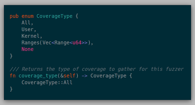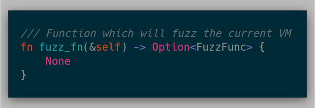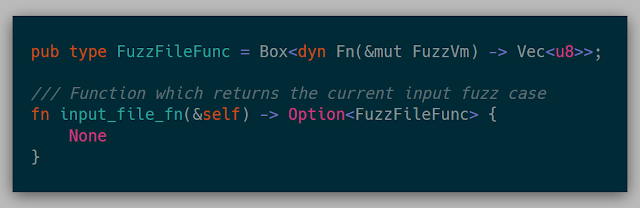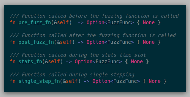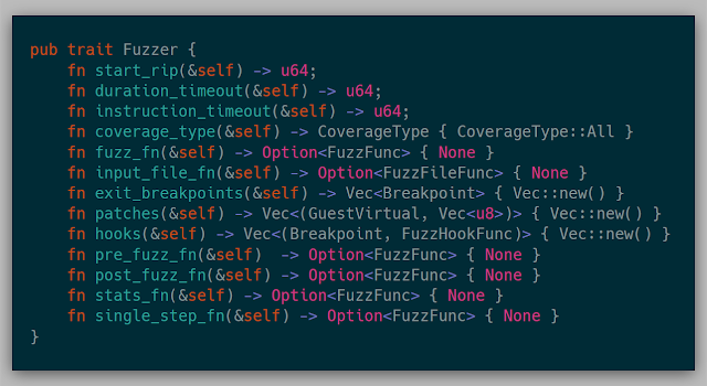 While I know I can modify all the internals of the hypervisor whenever needed, I wanted to abstract away any fuzzer so that each fuzzer is isolated from the hypervisor mechanics themselves. The hypervisor is aware of this interface, so implementing some/all of these methods would enable the fuzzer. The full trait is: