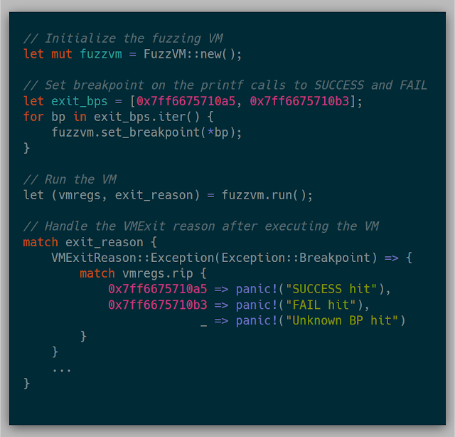 The last piece of the puzzle before executing the snapshot is figuring out how to stop a given execution. A possible solution could be to use the same vmcall instruction as before at a given instruction and catch every VMExit on the vmcall. Another solution is to write 0xcc for debug breakpoints at an instruction that we wanted to break at and then catch the Breakpoint VMExit. While those are fantastic solutions, at the time, I actually chose to force a divide by zero. A divide error could be seen as a VMExit and then the state of the process could be analyzed at that location.