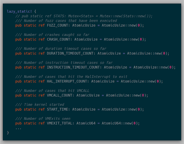 Along with the mechanics of fuzzing, gathering statistics about the system helps with discovering where time is spent in the fuzzer to know where various bottlenecks exist. This implementation uses several global atomic variables for keeping track of stats. Since my test environment was only a four-core machine, this was acceptable. If I had more cores, this would probably bottleneck on the atomics themselves, as locking the atomic over dozens of cores is quite slow, but for this research, it wasn't as much of an issue.