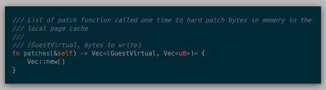 A Fuzzer can also implement patches to a given snapshot. This will write the given bytes into the current page of the VM as well as permanently changes the bytes in the page cache.