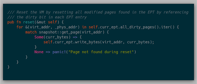 The beauty of resetting a VM is that resetting every page in the VM itself isn't necessary (this idea came from this talk). The EPT provides a "dirty bit" that is set if the page at a particular EPT entry was modified. Using this information, a simple page table walk tells the kernel which pages need to be reset, causing us to bypass many expensive page copies.